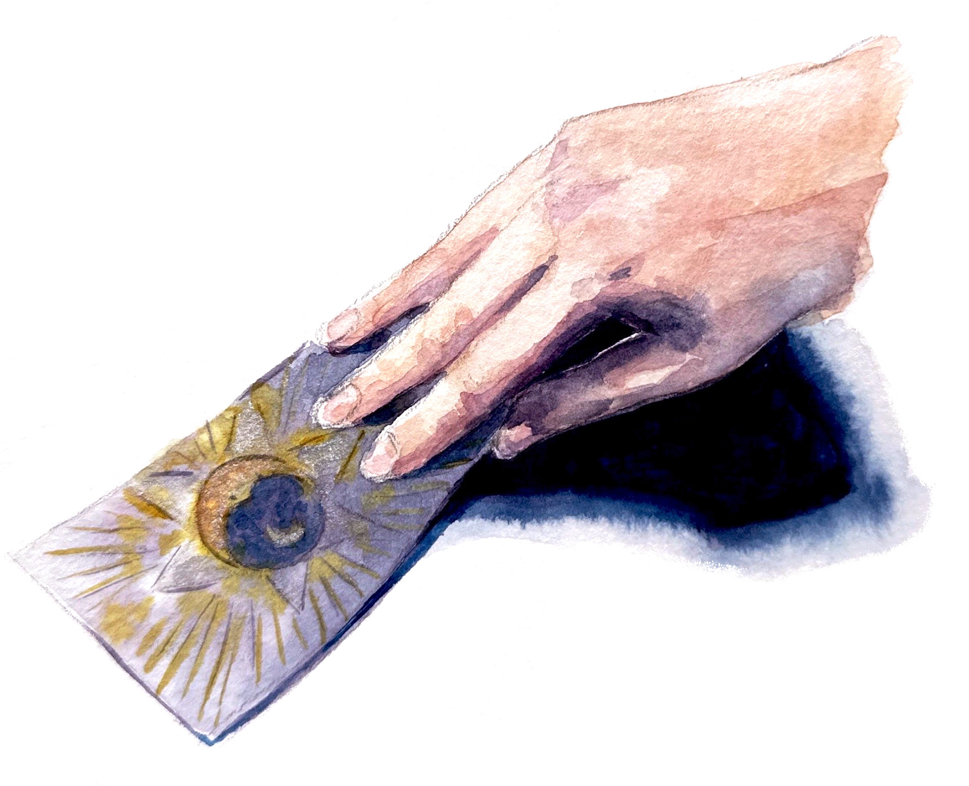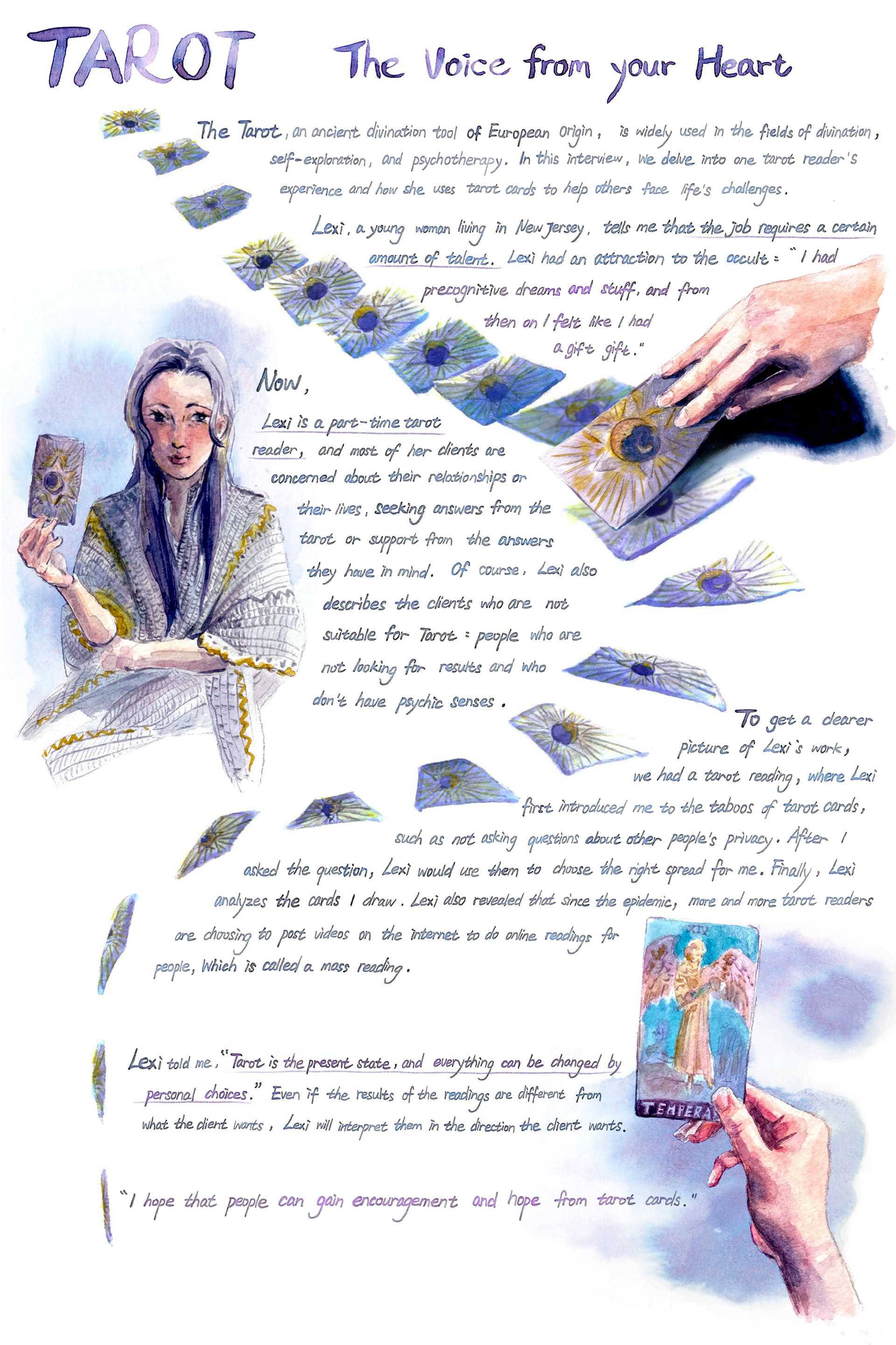 For this visual essay, I chose to interview a tarot diviner and use watercolor and ink to complete the final image. My workflow for this project was to interview and take notes, draw drafts of the composition, select important pieces to write about, draw watercolor illustrations, handwrite the article and title, and finally electronically process and put it all together.